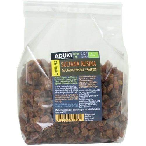 Aduki kullankellertävät luomusultanarusinat ovat maittava naposteltava sekä oiva lisuke ruoanlaittoon. Liottamalla rusinoita yön yli saat niistä vielä mehevämpiä esimerkiksi salaattiin ripoteltavaksi.